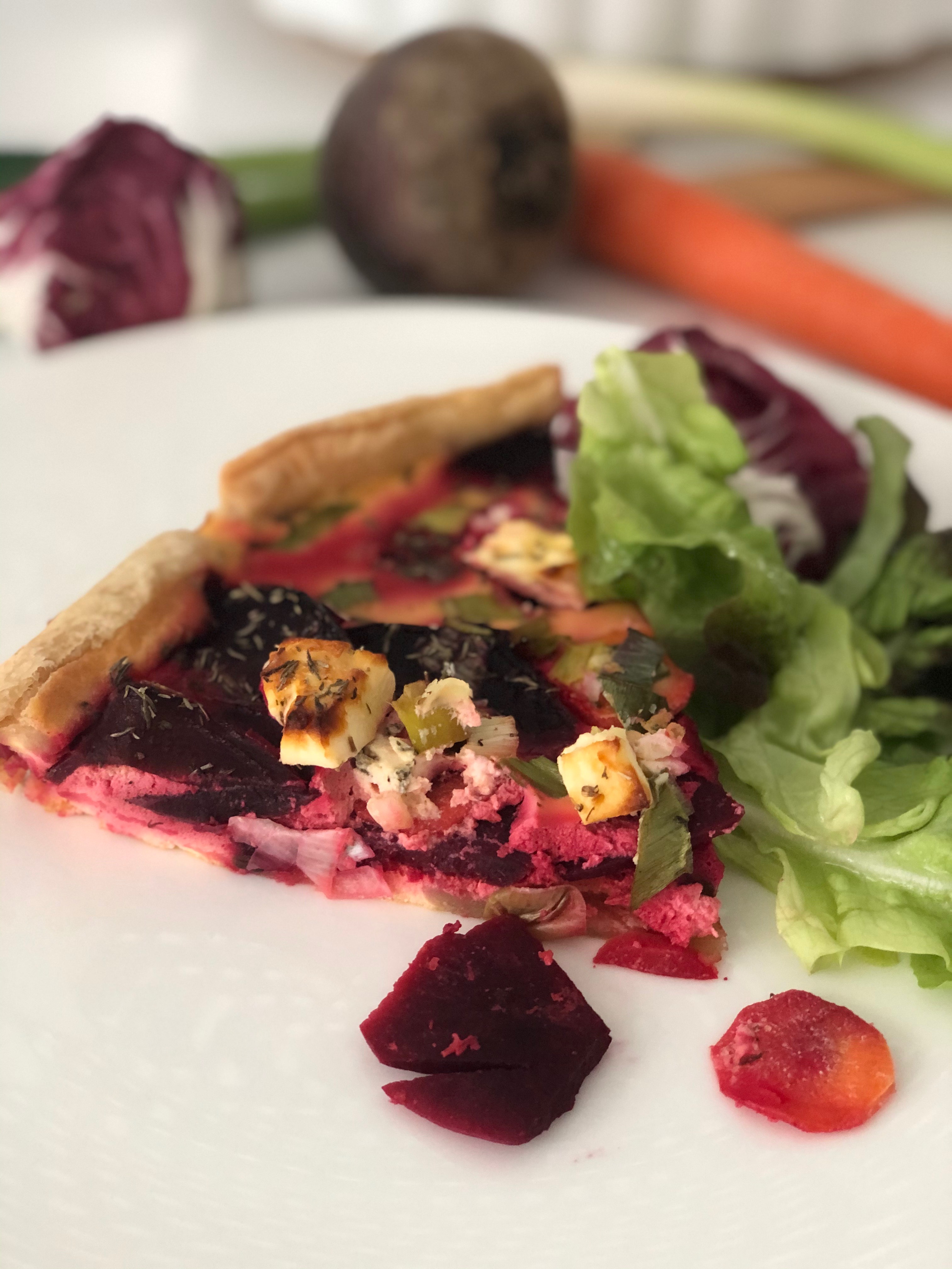 Vegetarische Blätterteig-Tarte mit Roter-Beete, Karotten, Frühlingszwiebeln und Feta-Käse